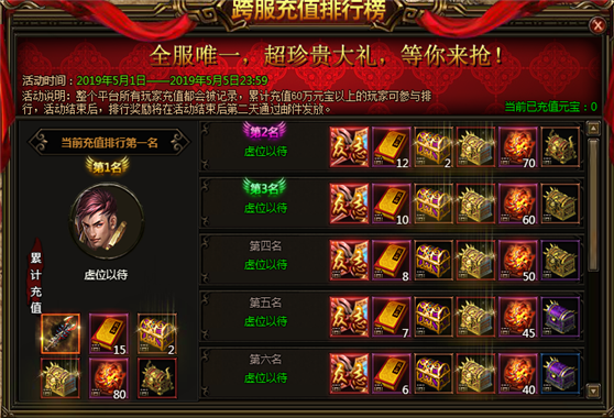 2、活动说明:活动期间,整个平台所有玩家充值都会被记录,累计充值600000元宝以上的玩家可参与排行,活动结束后,排行奖励将在活动结束后第二天通过邮件发放