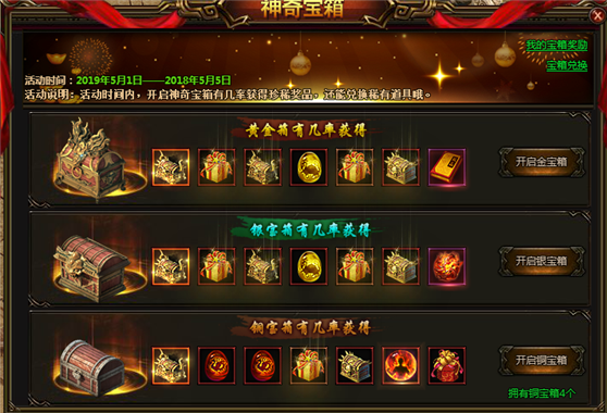 2、活动说明:活动期间,开启神器宝箱有几率获得珍稀奖品(武器随机宝箱,天地至尊极品宝箱,诸神极品宝箱,莲花灵子精魄等),还能兑换稀有道具