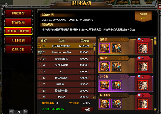 本活动取:限时活动内的跨服充值排行榜排行发放奖励。(取:2019年5月31日23:59分实时排行榜数据为准)