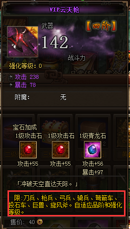 | 注:vip武器使用后将随武将等级改变品阶和强化等级,武将等级越高装备属性越高。 | |